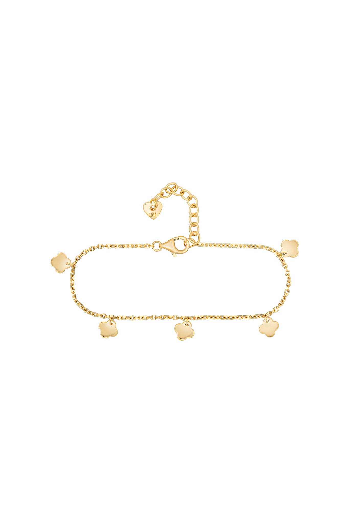 Das Armband aus 925 Silber gelb vergoldet besitzt fünf kleine Kleeblattanhänger und hat eine Länge von 15 + 3 cm. Das Armkettchen aus der 'Clover' Kollektion wird in einem Etui geliefert.