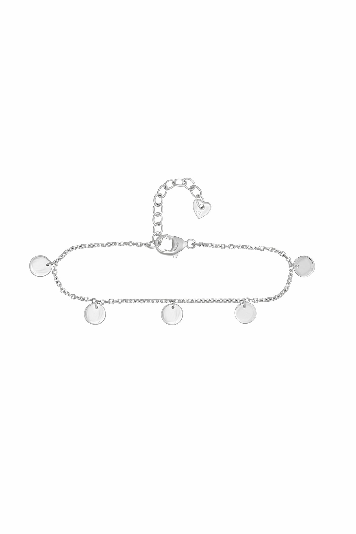 Die Fußkette in 925 Sterling Silber rhodiniert aus der Kollektion 'Boho' hat eine Länge von 22 cm mit 3 cm Verlängerungskette. Die fünf Plättchen haben je einen Durchmesser von 6 mm.