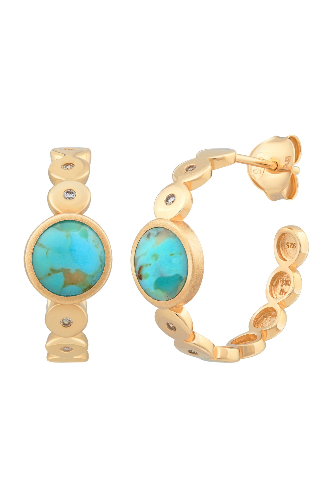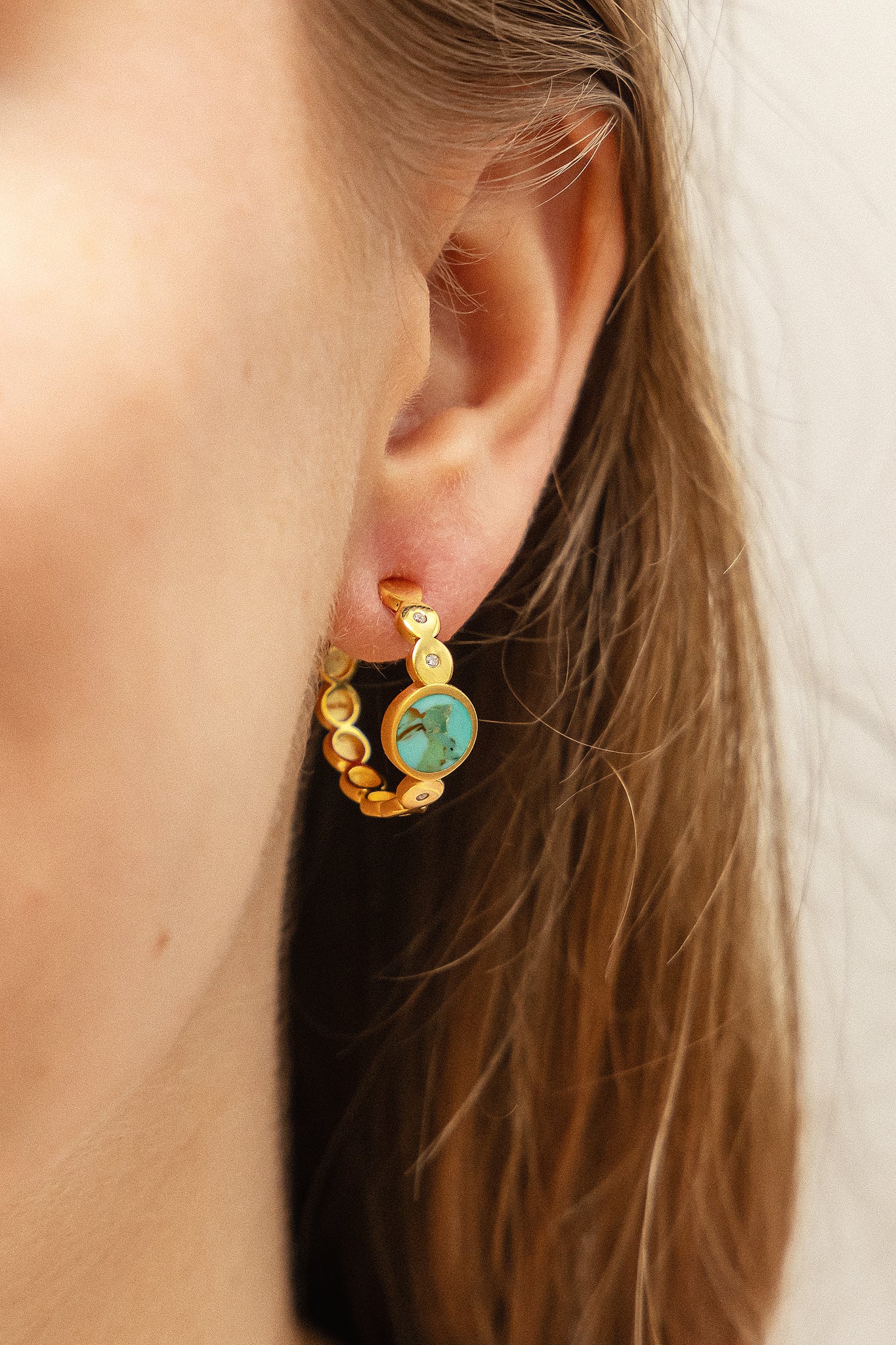 Ohrringe 925 Silber vergoldet mit Echtstein Türkis und Zirkonia. Die Silbercreolen haben einen Durchmesser von 2cm. Das perfekte Schmuckstück für Stein Liebhaber.