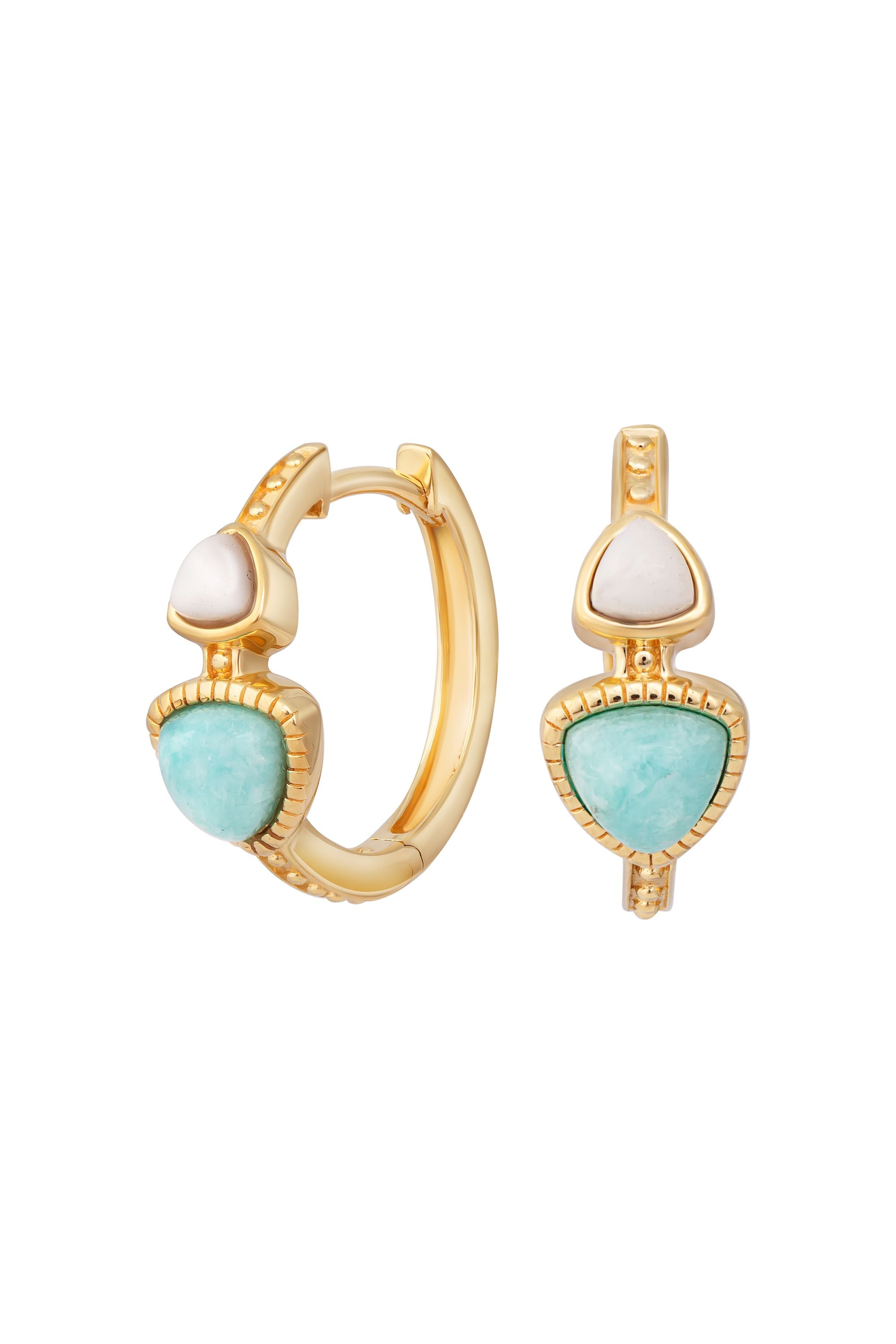 Creolen aus 925 Sterling Silber vergoldet mit einem echten blauen Amazonit 5mm und einem weißen Achat 3mm. Die Klapp-Creolen mit einem Durchmesser von 18mm aus der Kollektion 'Boho Stones' sind wasserfest.