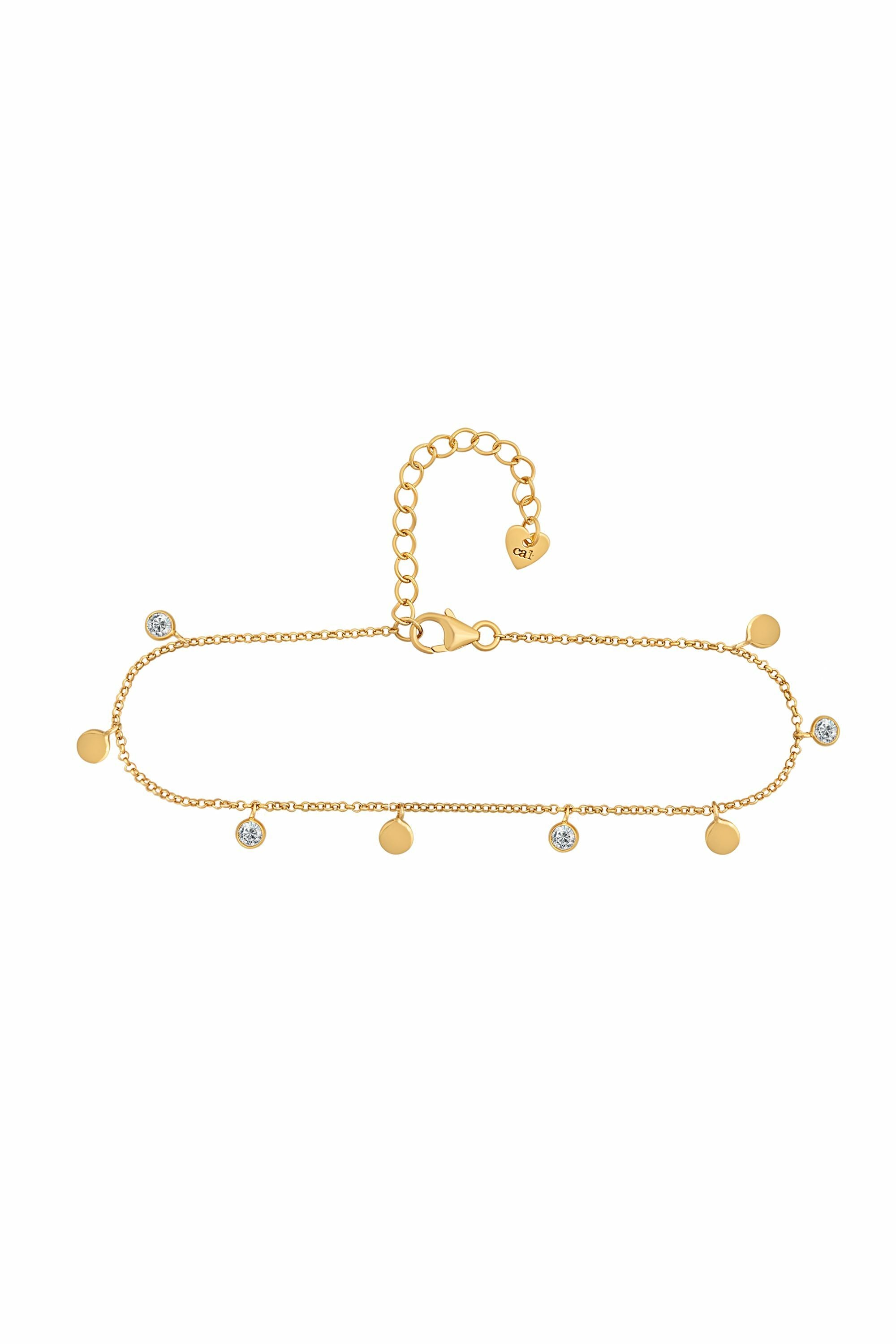 Die Fußkette aus der Kollektion 'Shiny Layers' in 925 Silber vergoldet hat acht Anhänger – vier Plättchen und vier Zirkonia – in je 4 mm Länge. Die facettierte Kugelkette hat eine Länge von 22+3 cm.