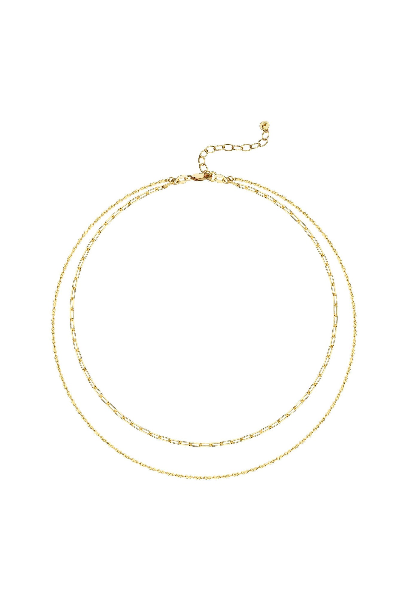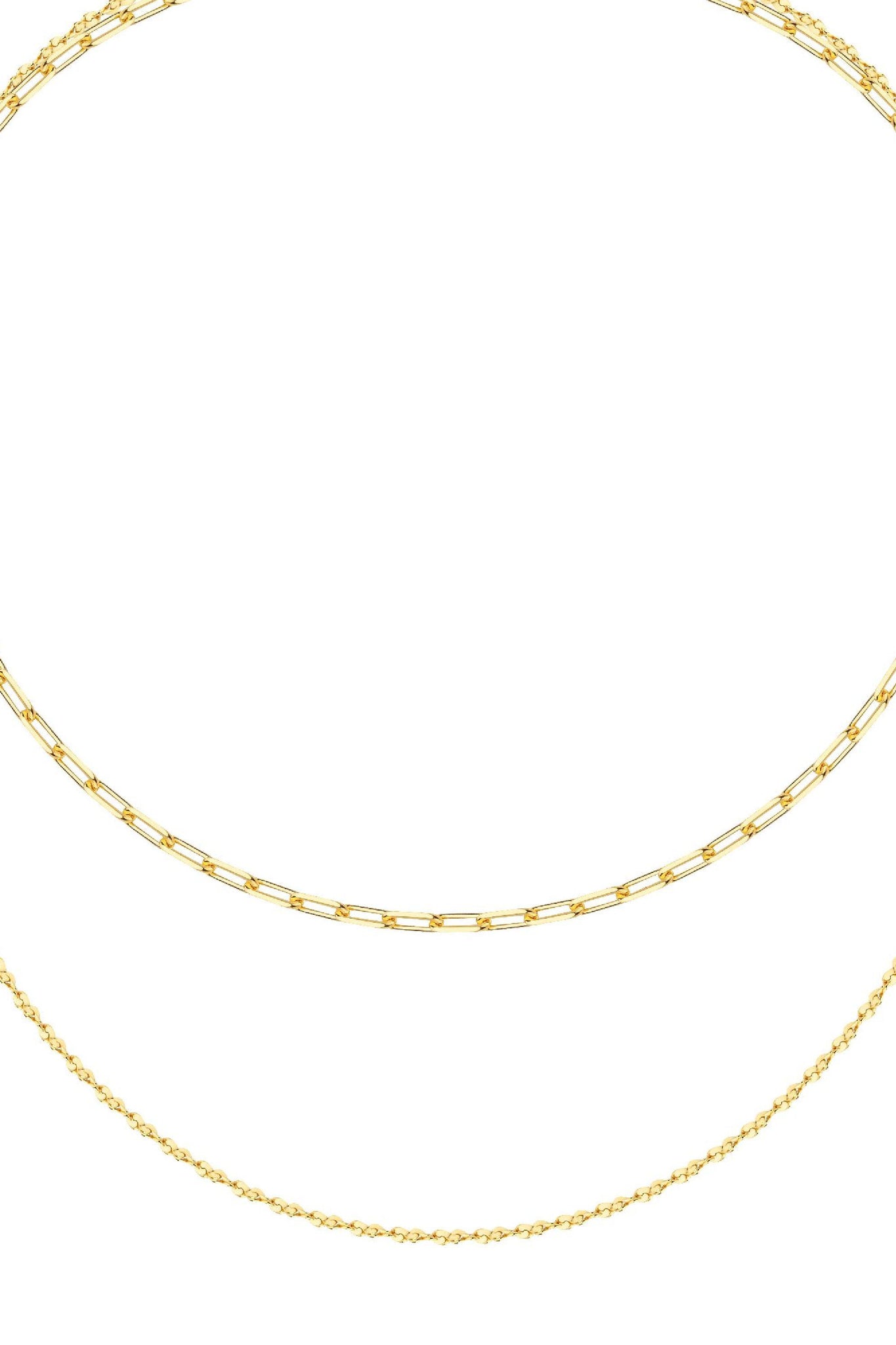 Zweifach gearbeitete Layering-Halskette aus vergoldetem 925er Sterling Silber. Die Kombination aus zwei fein abgestuften Ketten sorgt für einen modernen, femininen Look – ideal zum Solo-Tragen oder zum Kombinieren. Die Länge beträgt 40 cm und lässt sich durch eine 5 cm Verlängerung individuell anpassen.