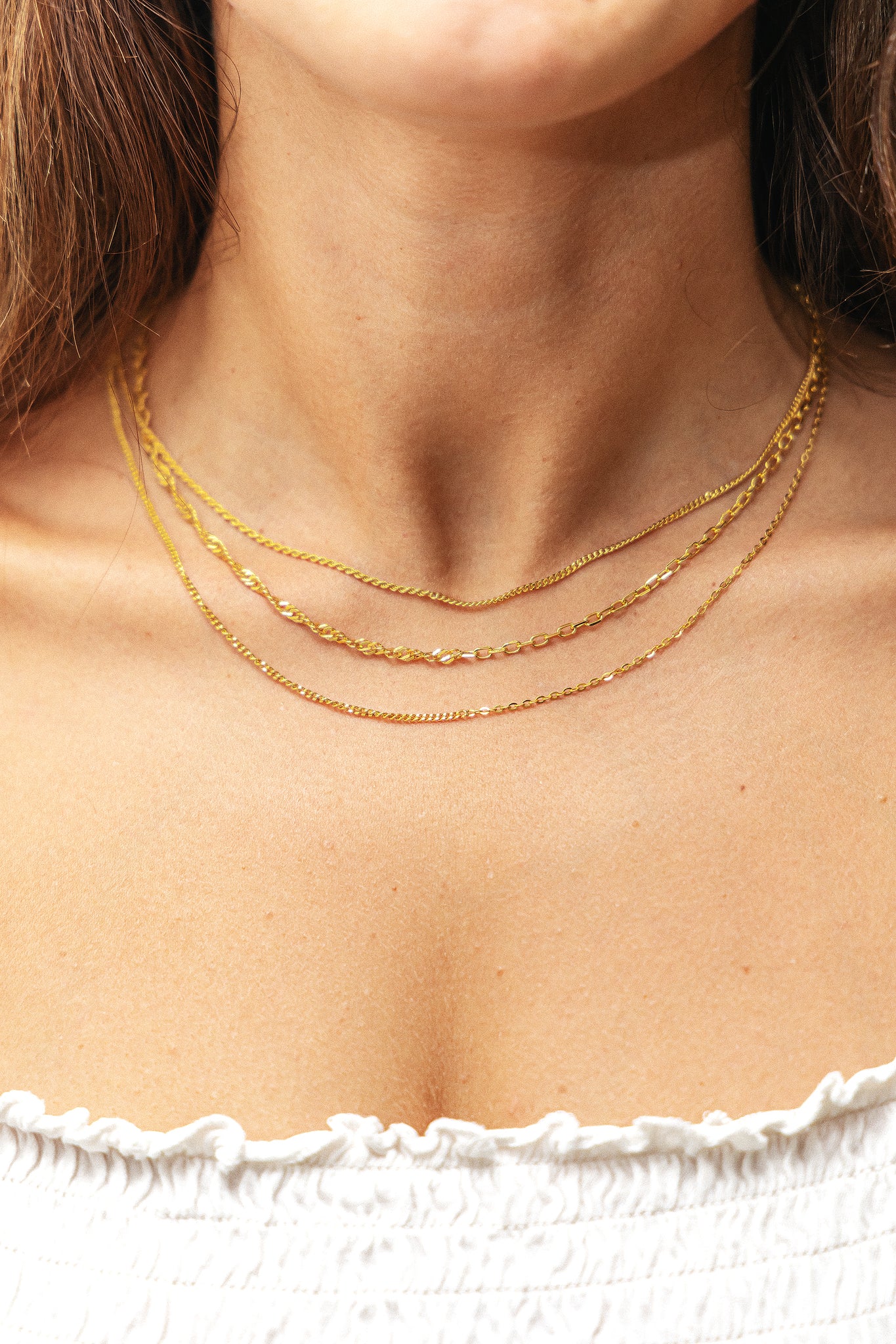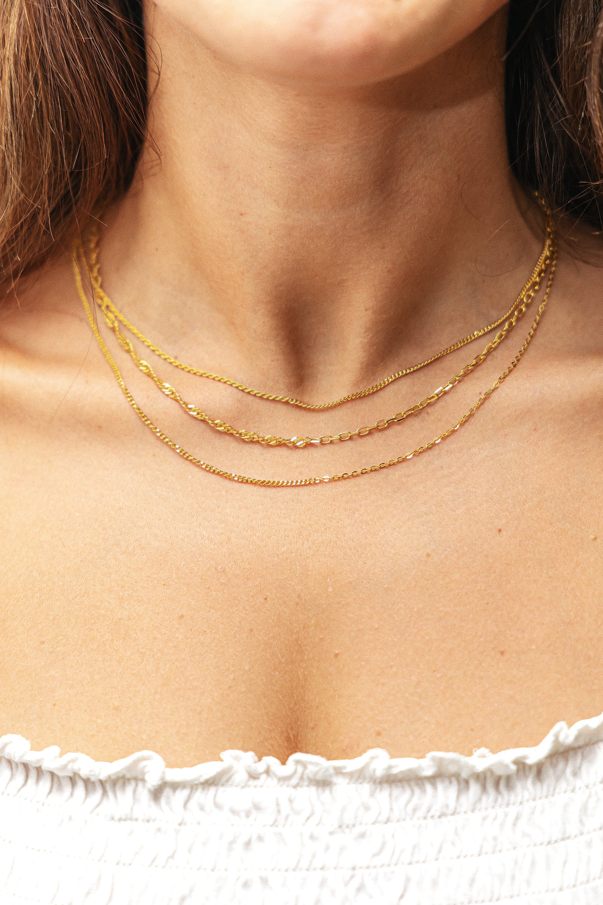 Damen-Halskette aus 925 Sterling Silber im Mixed Chain Design. Das feine goldfarbene Collier hat eine Länge von 45cm. Die Kette eignet sich ideal zum Layering, ist aber auch einzeln getragen ein absoluter Eye-Catcher.