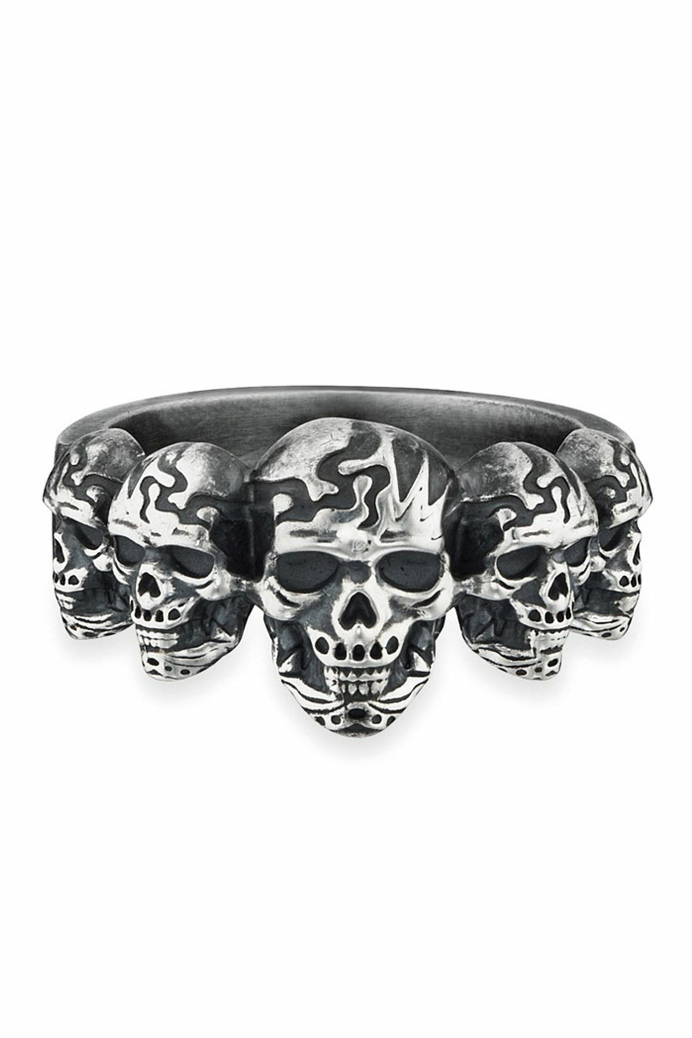 cai men - Herren-Ring in 925/- Sterling Silber rhodiniert und matt oxidiert mit fünf detailreich gestalteten Totenköpfen aus der Kollektion 'urban fighter'. Der Ringkopf hat eine Breite von ca. 12mm und ist ca. 4mm stark. Zur Seite hin werden die Totenköpfe kleiner mit ca. 8,4mm Breite. Die massive Ringschiene hat eine Breite von ca. 6mm und ist ca. 1,8mm stark. Der Artikel wird in einer Schmuckverpackung geliefert.