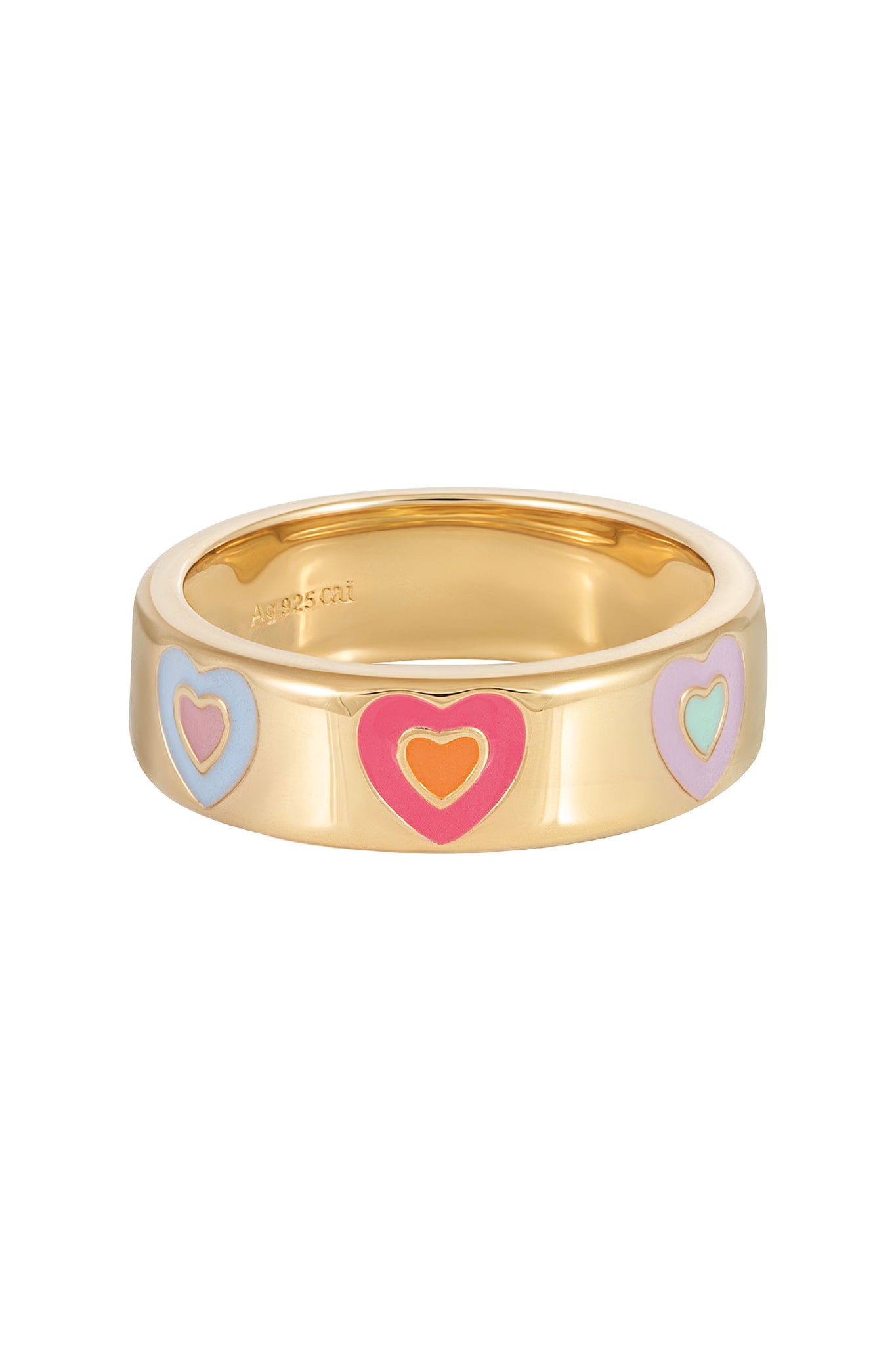 Der Ring aus 925 Silber gelb vergoldet mit pastellfarbenen Email Herzen wird in einem Etui zur sicheren Aufbewahrung geliefert. Der Ring ist gut kombinierbar mit anderen Schmuckstücken.