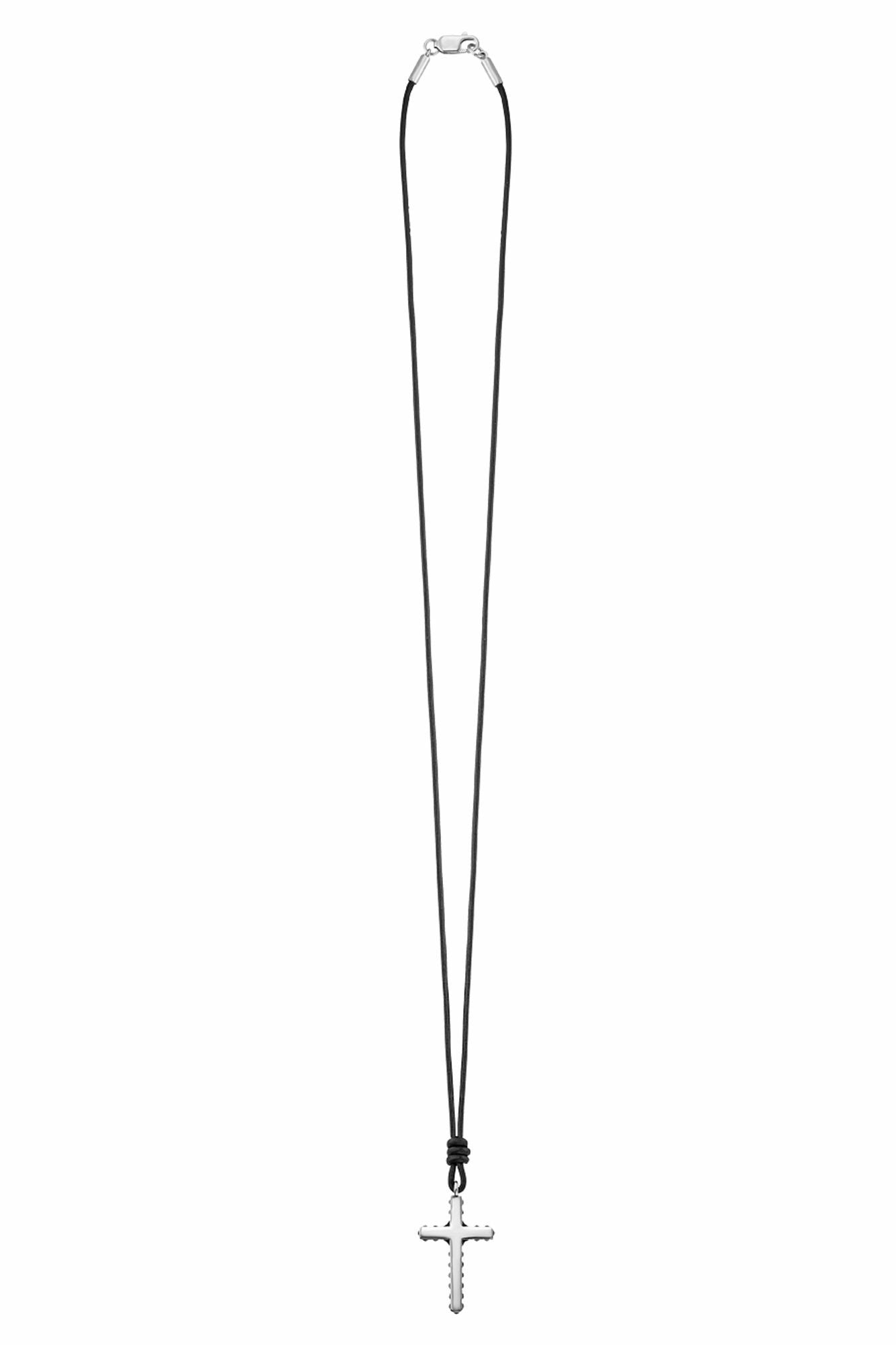 cai men - Herren-Anhänger mit Kette in 925/- Sterling Silber rhodiniert aus der Kollektion 'royal punk'. Der kreuzförmige Anhänger mit edler seitlicher Pyramidenstruktur ist an einem schwarzen Lederband angebracht. Die Oberfläche wurde nach dem Rhodinieren zusätzlich mit schwarzem Lack behandelt, um das Design noch besser hervorzuheben. Der Kreuzanhänger ist ca. 29mm hoch, ca. 19mm breit und ca. 3mm stark. Das Lederband ist ca. 55cm lang und wird mit einem Karabiner verschlossen.
