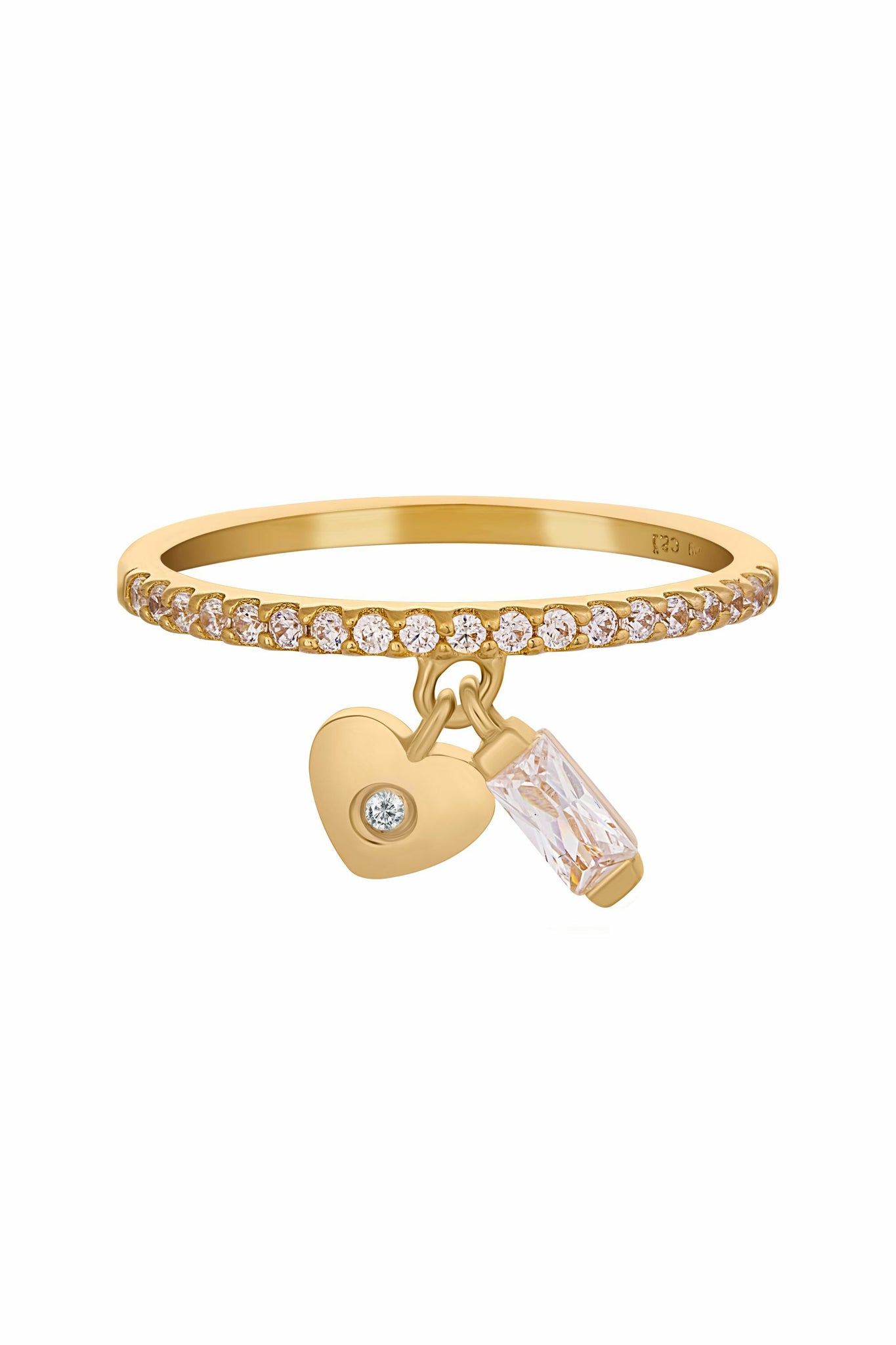 Ring 925 Silber vergoldet besetzt mit 19 Zirkonia und mit zwei Anhängern. Ein Anhänger in Herzform mit kleinem Zirkonia, der zweite mit Zirkonia in Baguetteform.